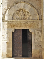 | リンテルは、ローマ時代の大理石のマイルストーンが再利用されていて、様式化されたアカンサスの葉の唐草模様で装飾されています。装飾は12世紀半ばに彫刻されました。 ラテン語の銘には、1178年という年と、マグローヌのカテドラル創建を語る12世紀に編まれた伝説、プロヴァンス伯の息子ピエールとナポリ王女の物語の作者である、ベルナール・ド・トレヴィエのサインが見られます。このリンテルは、12世紀のファサードの入り口にも利用されていたと考えられます。 |