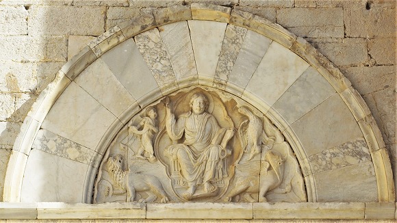 | Le tympan sculpté en marbre blanc dans un esprit gothique, a été réalisé dans les années 1260. Il représente le Christ en majesté : dans un mandorle polylobé, le Christ drapé à l'ancien et assis sur un trône cannelé, bénit de la main droite, et tient le Livre de l'autre main. Il est entouré des symboles de quatre évangélistes (l'ange, l'aigle, le lion et le boeuf) de l'Apocalypse, portant des phylactères. L'ensemble est encadré des nuages ondulés. |