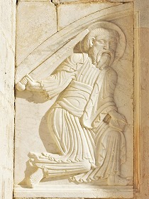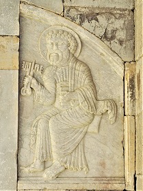 | 12世紀に遡るこれら2つのレリーフも、コンソール同様、12世紀のファサードの最初のタンパンの一部でした。 12世紀に教会堂が完成した時、身廊は2身廊で、建物は2番目のベイの端で壁で閉じられていました。その壁には入り口が設けられていて、その入り口は、ペトロとパウロのレリーフや、コンソールにある2人の使徒の頭などで構成された、半円型のタンパンで装飾されていました。またこのタンパンは、現在使われているリンテルに支えられていたようです。 身廊は1260年代に、2つの塔が建設された時に1ベイに西に拡張され、現在のファサードが1260年代に造られました。 |