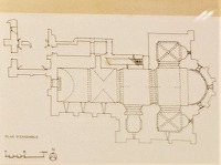 | Plan de l'église 教会堂は3ベイの単身廊、トランセプト、アプスで構成されます。身廊西側の2ベイの上に、トリビューンがあります。 L'église est constituée d'une nef unique de trois travées, d'un transept et d'une abside. Une tribune surmonte les deux travées occidentales de la nef. |