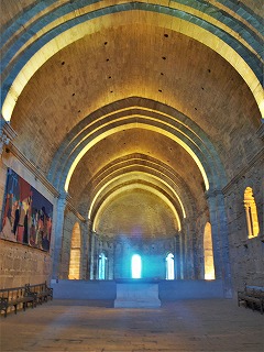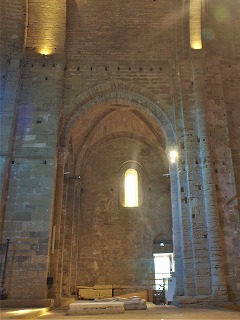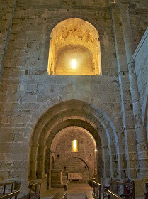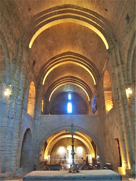 左はアプスから身廊を見たイメージです。 身廊全体は緩やかな尖頭型のヴォールトで覆われています。幅10メートル、高さ19.75メートルという大きさです。壁の厚みは2-2.5メートルもあります。 三重になった横断アーチは、壁際のアカンサスの葉が彫刻された柱頭がある円柱に繋がります。 L'ensemble de la nef est couvert de la voûte en berceau légèrement brisé, et mesure 10 m de largeur et 19,75 m de hauteur, avec des murs de 2 à 2,5 m d'épaisseur. Les arc-doubleaux à triple rouleau retombent sur les colonnes engagées à chapiteaux sculptés à feuilles d'acanthe. 直接光が届かないため、身廊は暗いです。但し上階のトリビューンに開口部が幾つか設けられています。 La nef dépourvue de l'éclairage direct, est sombre, excepté la tribune à l'étage avec quelques baies. |
