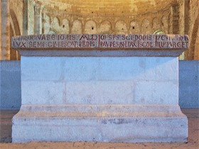 | Autel トリビューンには当初、ニコラオスに捧げられた祭壇がありましたが、これは消失しています。今日では、1912年にフレデリック・ファブレージュが発見した、1190年に亡くなったマグローヌ司教ジャン・ド・モンロー墓石が新たに祭壇として設置されています。これは石棺の蓋で、ラテン語の碑文が刻まれています。 L'autel originel disparu, dédié à saint Nicolas, a été remplacé par la pierre tombale de l'évêque Jean de Montlaur, le bâtisseur de la nef, mort en 1190, mise au jour en 1912 par Frédéric Fabrège. Il s'agit du couvercle du sarcophage, sur lequel est gravée une épitaphe en vers latins. |