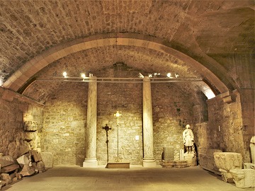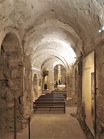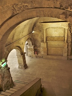| 修道院が建つ場所は、マッサリアの街の外に位置する、ギリシア期に開拓された採石場でした。この採石場はヘレニズム期には共同墓地として利用されました。 ローマ期、250年のキリスト教徒迫害で殉教した2人の人物の墓の周りで墓地は発展し、この墓地に、304年頃殉教したヴィクトールは埋葬されたとされます。そして440年頃、聖人の墓の近くに初期バジリカが建てられました。 サン・タンドレ祭室の東側にある開口部から、墓地の遺構を覗き見ることができます。 |