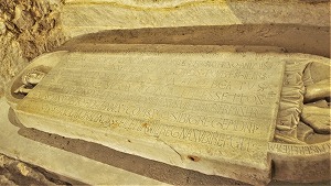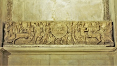 Sarcophage du sacrifice d'Abraham 南翼廊の4番目のベイに、1970年に身廊のピラー補強工事の際に発見された、トラバーチンで造られた石棺があります。 正面中央では、キリストが山の上に立ち、足下から4つの川が流れ出ています。キリストは左手でペトロに巻物を渡し、パウロの頭上で右手をあげています。 右側では、イエスが人差し指で盲人の目に触れ、癒しています。 左側には、イサクの燔祭の場面が描かれています。アブラハムは右手で刀を振りかざし、左手でしゃがみこんだ息子をおさえています。そこで天から神の手が現れ、アブラハムを制します。一頭の山羊がアブラハムのマントを引っ張っています。 Dans la troisième travée du bas-côté sud, est exposé un sarcophage en travertin, exhumé en 1970, lors des travaux de consolidation des piliers de la nef. Au centre de la face, le Christ est sur une montagne d'où s'écoulent les quatre fleuves. De la main gauche, il donne un rouleau à Pierre et lève la main droite au-dessus de Paul. A droite, Jésus guérit un aveugle en lui touchant les yeux de l'index. |