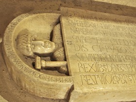 Dalle funéraire d'Isarn 11世紀末に遡るこのイザーン修道院長の墓碑は、ローマ時代の石棺の底をリカットして制作されました。 8行からなる銘が刻まれた長方形の石板の両端に、2つの半円形のスペースがあります。左側の半円スペースには、修道院長の頭と杖が、右側には両足が見えます。 Réalisée à la fin du 11 siècle, la pierre tombale de l'abbé Isarn a été travillée dans le fond retaillé d'un sarcophage antique. La plaque rectangulaire d'inscription sur huit lignes, est encadrée de deux demi-cercles : la tête de l'abbé et le bâton sont représentés à gauche, et ses pieds à droite. |