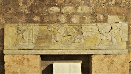 | Sarcophage du Christ en gloire このカシの石で造られた石棺は、5世紀半ばに遡ります。残されていた古いデッサンに基づき部分的に復元されました。 中央に、玉座につき本を手にしたキリストが、天使に支えられたメダイヨンの中に描かれています。左端にパウロ、右端に十字架を掲げたペトロが見えます。 Ce sarcophage en pierre de Cassis date du milieu du 5e siècle. Il ne subsiste que des fragments qui ont permis une reconstitution grâce aux anciens dessins. Au centre, est représenté le Christ trônant et tenant un livre dans un médaillon porté par deux anges. Aux extrémités, se trouvent saint Paul à gauche, et saint Pierre portant la croix à droite. |