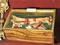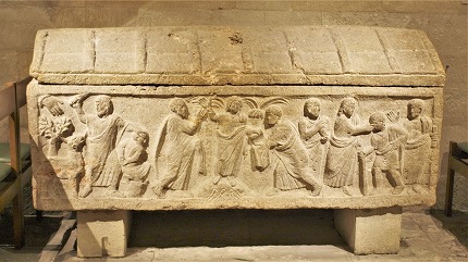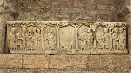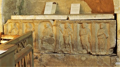 | Sarcophage de Saint-Cassien 今日ノートル・ダム・ド・コンフェッション祭室の祭壇として利用されているピレネーの大理石でできたカッシアヌスの石棺は、5世紀前半に制作されました。 ピラスターに支えられたアーケードの下には、中央に祈るポーズをした若者がおり、この若者を両脇の年輩の2人の人物が指し示しています。左端に、子を奉献するカップルの姿があります。 Utilisé actuellement comme un autel de la chapelle, ce sarcophage en marbre pyrénéen, a été réalisé à la première moitié du 5e siècle. Sous les arcades reposant sur les pilastres, se trouve au centre, un adolescent en orant, désigné par deux personnages âgés, placés à ses côtés. A l'extrémité gauche, est figuré un couple présentant en offrande un enfant. |