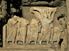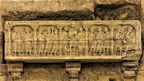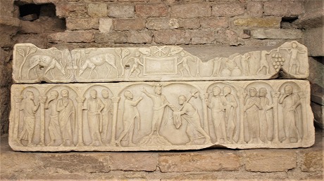 | Sarcophage de saint Chrysante et sainte Darie カッラーラの大理石で造られたこの石棺は、4世紀末に遡ります。 正面中央には、山の上に十字架が立てられていて、山から楽園の川が流れ出ています。そこで2頭の鹿が喉を潤しています。 左側には、パウロの生涯が刻まれています(パウロの捕縛、パウロの殉教)。他方右側には、ペトロの生涯が描かれています(ペトロのキリスト否認、ペトロの捕縛)。 Ce sarcophage en marbre de Carrare date de la fin du 4e siècle. Au centre de la grande face, se trouve une croix sur une montagne d'où s'écoulent les fleuves du paradis, dans lesquelles deux cerfs s'abreuvent. A gauche, est représentée la vie de saint Paul (son arrestation par un soldat et son martyre), et à droite, la vie de saint Pierre (le reniement de saint Pierre, et son arrestation). |