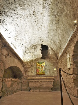 Chapelle Saint-Lazare 岩を穿つようにして造られたサン・ラザロ祭室は、ノートル・ダム・ド・コンフェッション祭室の東側に位置します。 この祭室のヴォールトは2本の円柱に支えられていて、一方の円柱はらせん状になっていて柱頭彫刻があり、もう一方の円柱の上には、カッシアヌスと共にマルセイユにやって来た、エクサン・プロヴァンス司教ラザロの顔が彫られています。 Taillée dans le rocher, la chapelle Saint-Lazare se situe à l'est de l'ancien martyrium. Sa voûte est soutenue par deux colonnes, dont l'une torse à chapiteau sculpté, et l'autre surmontée d'un visage de Lazare, évêque d'Aix-en-Provence, venu à Marseille avec saint Cassien. ラザロは隠居してサン・ヴィクトール修道院に身を寄せ、441年にここで亡くなり、遺体はサン・ヴィクトールのクリプトに埋葬されました。 Saint Lazare s'est retiré à l'abbaye de Saint-Victor, dans laquelle il est mort en 441. Son corps a été enseveli dans la crypte de Saint-Victor. |