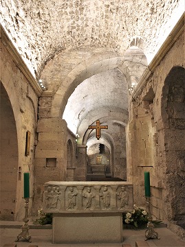 旧殉教者礼拝堂は、身廊と両側廊で構成されます。 身廊に、クリプト改修工事の時1965年に発見された、3世紀の殉教者を埋葬した2つの墓があります。墓は4世紀に遡り、南北軸に置かれ、厚い墓石で塞がれていますが、今日その構造を観察することができます。 L'ancien martyrium se compose de la nef et deux bas-côtés. Dans la nef, se trouvent deux tombes des martyrs du 3e siècle, probablement Volusianus et Fortunatus, mis au jour en 1965, lors de la réfection de la crypte. De la fin du 4e siècle, ces tombes de direction nord-sud, sont renfermées par de lourdes dalles, mais sa structure est aujourd'hui visible. 初期バジリカの軸は南北にありました。13世紀にクリプトが再整備された際、ノートル・ダム・ド・コンフェッション祭室の祭壇が、東向きの上部教会堂に倣って、東に置かれました。 |