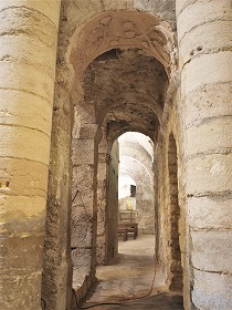 Bas-côté oriental du martyrium 初期バジリカの東側廊にあたる部分は、5世紀に遡ります。側廊のアーケードの内側に、スタッコの美しい装飾が見えます。他方、西側廊は、中世に大幅に改修されています。 Le bas-côté oriental remonte au 5e siècle. Il subsiste un beau décor du stuc dans l'intrados de l'arcade. Le bas-côté occidental a été fortement modifié au Moyen Age. |