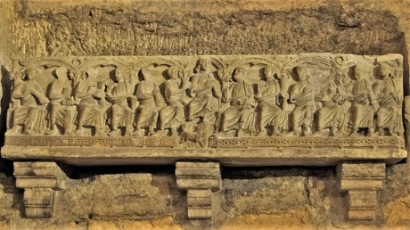| Sarcophage des sept dormants これは4世紀末にカッラーラの大理石で制作された、7人の眠り男(Seven Sleepers)の石棺の断片です。 この断片には、5人の使徒が並んでいます。 Il s'agit d'un fragment d'un sarcophage en marbre de Carrare datant de la fin du 4e siècle. Il représente une procession de cinq apôtres. |