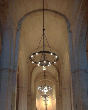 | 中央身廊と両側廊は、尖頭型ヴォールトで覆われていて、横断アーチがわたされています。中央身廊と側廊は、方形のピラーからのぼる尖頭型のアーケードで隔てられています。 半円型のアーチで直接身廊と繋がるアプスは5面のプランで、オジーヴ・ヴォールトに覆われ、設けられた5つの開口部は不揃いです。 両側廊の東端は、セミ・ドームに覆われた後陣祭室になっています。 Trois nefs sont voûtées en berceau brisé à arcs-doubleaux. La nef centrale est séparée des bas-côtés par de grandes arcades brisées, reposant sur des piliers carrés. S'ouvrant directement sur la nef par l'arc triomphal en plein cintre, l'abside à cinq pans est couverte de la voûte d'ogive, et percée de cinq fenêtres inégales. Les bas-côtés se terminent du côté oriental, par des absidioles en cul-de-four. |