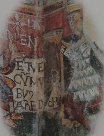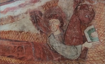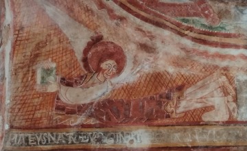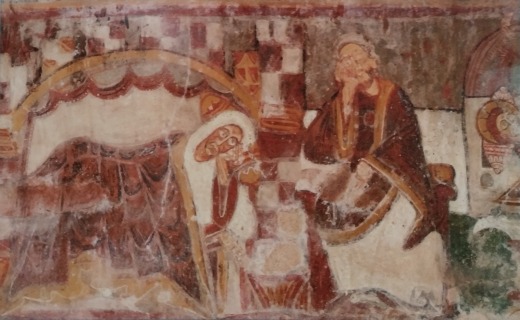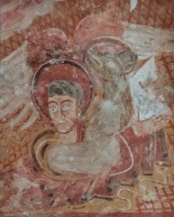 | 北壁の右端に、翼を広げた天使の姿があります。これは羊飼いへのお告げの場面の一部分で、天使のみが残ります。この天使は、キリストの誕生を東の壁に描かれていたに違いない羊飼い達に伝えていると考えられますが、今日羊飼い達の姿は失われてしまっています。 | ||
