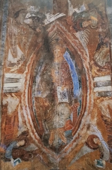 | 受肉の物語の上には、黙示録の長老達が描かれます。しかしここでは18人の姿しかなく、欠けている6人は身廊とアプスの間のアーチに描かれていたと考えられます。 長老達の下に、ヨハネの黙示録第5章8節を引用した、以下のような内容のラテン語の銘があります:「小羊が本を受け取ると、四頭の生き物と、竪琴と香で満ちた金の杯を手にした24人の長老が、小羊の前にひれ伏した」。 |