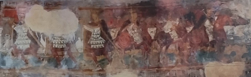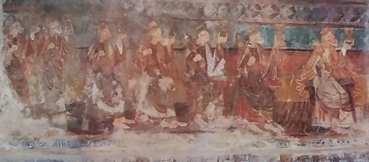 | A la partie inférieure du mur sud, entre deux bandes décorées de grecques, se déroule le cycle du voyage des Rois Mages : l'Adoration des Mages à gauche, et le leur Retour à droit. |