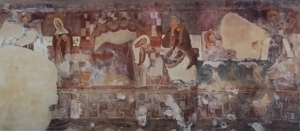 | A la partie inférieure des murs latéraux de l'abside, se déploie le cycle de l'Incarnation. Le récit commence sur le mur nord, de gauche à droite avec l'Annonciation, la Nativité et l'Annonce aux bergers, et puis se poursuit sur le mur sud avec le voyage des Rois Mages. Les scènes de l'Incarnation sont encadrées en haut et en bas, par deux bandes ornées de grecques, dont l'une inférieure surmonte un décor peint des draperies blanches formant des festons. |