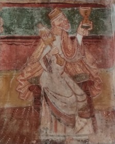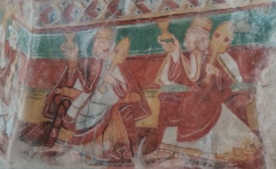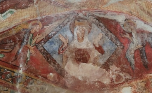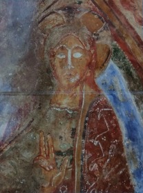 | 壁画はブオン・フレスコ技法で描かれ、デトランプで調整が施されています。顔料には、緑黄土、黄土、シナバー(辰砂)、石灰、ラズライト、インディゴ、カーボン・ブラックが使用されています。 この職人は、色の鮮やかさと、登場人物の表情の力強さが特徴です。また、頬を強調するために曲線を描く三角形が描かれていること、首と手にハッチング(面を平行線で埋める技法)を施していること、更には頬骨や額に赤い点のマークがあることにも注目されます。 1990年代に修復に携わった2人の修復家によると、フノラールの職人がアプスの装飾の制作に要した日数は僅か9日だったとされます。 |