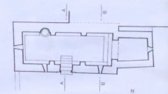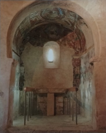 | Légèrement déviée vers le nord, l'abside trapézoïdale est également couverte de la voûte en berceau. Celle-là est séparée de la nef par un arc triomphal outrepassé reposant sur des impostes. |