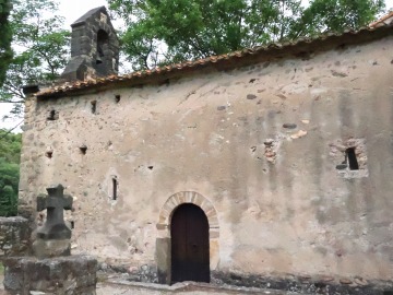| プレ・ロマネスクの建物は、方形のアプスや馬蹄型アーチといった西ゴート建築の特徴を見せます。 礼拝堂は小ぶりで、3ベイの単身廊とアプスで構成されます。 身廊は円筒型のヴォールトで、それを支える横断アーチは馬蹄型になっています。また身廊では、三方全ての壁に沿って石のベンチが設けられています。元来身廊は木造の木組み天井だったと考えられ、12世紀に石造ヴォールトに造り替えられました。 北に少し曲がっているアプスは台形プランで、円筒型のヴォールトで覆われています。アプスはインポストに繋がる馬蹄型のアーチで身廊と隔てられています。 L'édifice préroman présente des caractéristiques de l'architecture wisigothique, notamment son abside carrée et ses arcs outrepassés. La petite chapelle modeste est composée d'une nef unique de trois travées et d'une abside. La nef est voûtée en berceau à deux arcs doubleaux outrepassés et dotée d'un banc de pierre tout le long des murs. A l'origine, elle était probablement couverte d'une charpente, remplacée par la voûte à la premiére moitié du 12e siècle, juste avant la réalisation des peintures murales. |