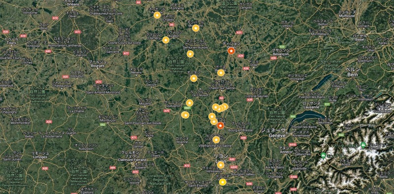 ディジョンとマコンからオズネー、ブランシオン、シャペーズには、トゥルニュ(上記参照)からアクセスします。タクシー又は自転車利用、ちなみに最も遠いシャペーズで、トゥルニュ駅より約16キロ、道中それなりに起伏はあります。 | ||