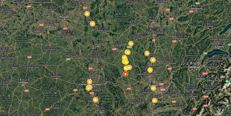 ディジョンからTGVで所要約1時間40分、TERで約2時間。マコンからTGVで約35分、TERで約45分。 | ||
