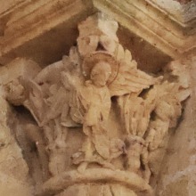 Chapiteaux historiés 入り口を囲む2つの円柱は、聖人伝が彫刻された柱頭を戴きます。 左の円柱の柱頭は、大天使が悪魔と戦う場面を描いています。場面中央にいる大天使は盾を持ち、フリジア帽を被っています。 右側の円柱の柱頭には、天使が福音記者ヨハネを導く様子が描かれます。 Encadrant le portail, deux colonnes sont couronnées de chapiteaux historiés. Le chapiteau de gauche illustre la lutte des archanges contre les démons. Au centre de la scène, un archange coiffé d'un bonnet pointu porte un bouclier. Le chapiteau de droite représente un ange conduisant saint Jean l'Evangéliste. |