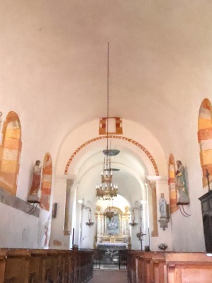 身廊は直接内陣に面していて、半円型のアーチ(いわゆる凱旋アーチ)で開かれています。このアーチは植物が彫刻された柱頭を冠する円柱に支えられています。 La nef s'ouvre directement sur le choeur par un arc triomphal en plein cintre porté par deux colonnes aux chapiteaux sculptés de feuillages. |