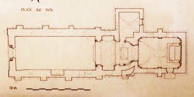 Plan de l'église ロマネスク期の教会堂は3ベイの単身廊、奥行きの狭い内陣、アプスで構成されていました。アプスは1777年に改築されていて、その東側に2ベイの葬儀の祭室が増築されました。この祭室は今日内陣として利用されています。 ロマネスクの鐘楼は内陣のベイの上に聳えます。アプスの北側にある聖具室も、12世紀に造られました。 L'église romane se composait initialement d'une nef unique de trois travées, d'une travée du choeur peu profonde et d'une abside hémicirculaire. Cette dernière a été transformée en 1777 par l'adjonction de son côté est, d'une chapelle funéraire de deux travées qui sert aujourd'hui de choeur. Le clocher roman se dresse au-dessus de la travée du choeur. Adossée au côté nord de l'abside, la sacristie est également datée du 12e siècle. |
