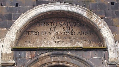 | Archivolte romane 入り口の上に、ロマネスクのアーキヴォールトが残り、かつては柱頭を戴く円柱に支えられていました。 アーキヴォールトを構成する石には、次のようなラテン語の銘が刻まれています、「この神殿に入る時、眼差しを高くあげよ。汝が踏み入る場所を敬え。キリストこそがその門である」。 Au-dessus du portail subsiste une archivolte romane, jadis portée par des colonnes à chapiteaux. Sur les claveaux de l'archivolte sont gravées des inscriptions latines : INGREDIENS TEMPLUM REFERAT AD SUBLIMIA VULTUS : INTRATURI AULAM VENERANSQUE LIMINA CHRISTI ("allant vers le temple, élève bien haut ton regard : respecte le lieu où tu entres : le Christ en est la porte"). |