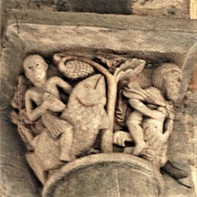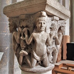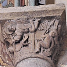 | この柱頭は、預言者ヨナの物語を描きます。 右側では、3人の船員のうちのひとりが、裸のヨナを船縁から海に投げ込んでいます。ヨナは巨大魚に丸呑みにされ、その腹の中で三日三晩過ごします。 左側では、モンスターのような魚がニネヴェの岸辺でヨナを吐き出しています。 ヨナ書に記されたこのエピソードは、初期キリスト教美術では頻繁に表現されますが、ロマネスクの時代では稀です。 A droite, l'un des trois marins précipite dans la mer un Jonas, nu, par-dessus le bord du bateau : le prophète va être avalé tout entier par un gros poisson et demeurer trois jours et trois nuits dans son ventre. A gauche, le monstre marin rejette Jonas sur le rivage de Ninive. Tiré du Livre de Jonas, cet épisode, très répandu dans l'art chrétien primitif, apparaît rarement à l'époque romane. |