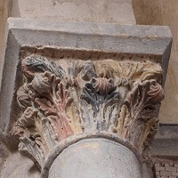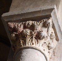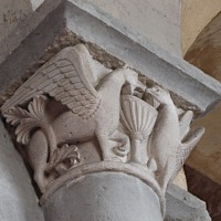 | 旧内陣の湾曲部の8つの円柱を飾っていた柱頭のうち、5つが発見されており、このうち3つは教会堂内部で展示されています(2つが身廊の西側、1つが内陣)。 もうひとつ、1914年以前に発見されたより損傷が見られるアトランテを描いた柱頭があり、これは修道院の石材の展示スペースにて保管されています。 5つめは四つの福音書を表現した柱頭(4人の天使が四福音書の冒頭のフレーズが刻まれたフィラクテールを手にしている)で、これは現在ロンドンのヴィクトリア・アンド・アルバート博物館に所蔵されています。 |