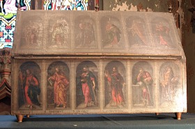 Châsse de saint Austremoine 南側の祭室の一室に、クレルモンの初代司教であり、オーヴェルニュの福音宣教者でもあった聖アウストレモニウスの遺骨がおさめられた、彩色された木製の聖遺物箱がおさめられています。 聖遺物箱の片側には12使徒が、もう一方には受胎告知とキリスト磔刑の場面が描かれています。 この聖遺物箱は16世紀末又は17世紀初頭に制作されました。カルミニウスの聖遺物箱と同じフォルムで同じ大きさだったとされる聖人の最初の聖遺物入れは失われています。 L'une des chapelles latérales méridionales abrite une châsse reliquaire en bois peint, renfermant les reliques de saint Austremoine, premier évêque de Clermont et évangélisateur de l'Auvergne. Sur l'une des faces de la châsse figurent les douze apôtres, tandis que l'autre présente l'Annonciation et la Crucifixion. La châsse a été réalisée à la fin du 16e ou au début du 17e siècle : celle d'origine, qui avait la même forme et les mêmes dimensions que la châsse de saint Calmin (voir ci-dessous), a disparue. |