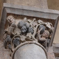 この柱頭はトビアとサムソンの2つの物語を描きます。 コーベルの中央に配された木の左側に、若いトビアが巨大な魚に馬乗りになっています。トビアはこの魚の肝臓と心臓、胆嚢が入った袋を握っています。 このテーマは旧約聖書のトビト記から引用されています。 木の右側では、顎髭を生やしたサムソンが、ライオンを倒しその顎を砕いています。 Ce chapiteau réunit à la fois l'histoire de Tobie et celle de Samson. Sur le côté gauche d'un arbre placé au centre de la corbeille, le jeune Tobie chevauche un énorme poisson. Il serre un sac renfermant le fiel, le coeur et le foie du poisson. Cette scène est tirée du Livre de Tobie, dans l'Ancien Testament. A droite de l'arbre, Samson, barbu, terrasse un lion et lui brise la mâchoire. |