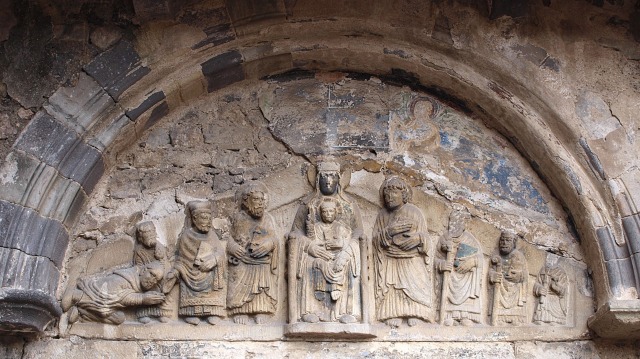 | Linteau de l'Hommage 南翼廊の西側にある入り口は、かつて回廊に面していました。現在は塞がれていますが、外側には山型のリンテルがタンパンの中に埋め込まれています。12世紀初頭に制作されたこのリンテルには、今も多彩色の痕跡が認められます。 |
