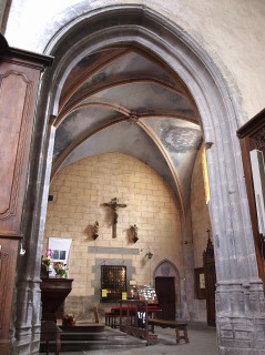 Transept トランセプトは一連の地震後、15世紀にほぼ全面的に再建されました。 翼廊は2ベイで、オジーヴ・ヴォールトに覆われています。後陣祭室は再建されませんでした。尚、北側後陣の基礎部分は1981年に発見されています。 Le transept a été presque entièrement reconstruit au 15e siècle, à la suite d'une série de tremblements de terre. Les croisillons de deux travées sont couverts de voûtes d'ogives. Les absidioles orientées n'ont été jamais reconstituées : les fondations de l'absidiole nord ont été découvertes en 1981. 北翼廊にある祭壇飾りの中央に、恐らく12世紀に制作された金銀で装飾されたキリスト磔刑像があります。 Dans le croisillon nord, le retable abrite en son centre un crucifix argenté et doré, probablement réalisé au 12e siècle. 南翼廊は、かつて回廊に通じる入り口を備えていました。これは修道士専用の教会堂への入り口でしたが、今日は塞がれています。それでもこの入り口の外側には、ロマネスクの時代に遡る彫刻装飾が施されたリンテルが残ります。 Le croisillon sud s'ouvrait autrefois sur le cloître par une porte, ancienne entrée de l'église réservée aux moines, aujourd'hui murée. Elle conserve toutefois, sur sa face extérieure, un linteau sculpté de l'époque romane. |