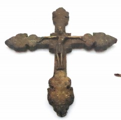 | Croix deprocession fin du 12e siècle, cuivre H50,8 : L40,8 cm 12世紀末に制作された銅製のキリスト磔刑像です。宗教行列の際に用いられていたものです。サイズは高さ50.8p、幅40.8pです。 十字架の腕部分は、四葉のフォルムの後、末端がフルール・ド・リスになっています。 Les branches de la croix se terminent en fleur de lys, précédées de motifs quadrilobés. |