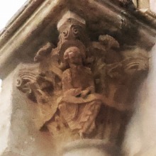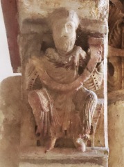 | Les chapiteaux recevant les voussures et les corbeaux portant le linteau sont chacun sculptés d'un prophète barbu tenant un phylactère déroulé. |