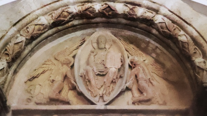 | 「アルシーのタンパン」と呼ばれるアンジー・ル・デュックのタンパンは、ブリオネ地方で最も美しいタンパンのひとつとされ、「フランス歴史的記念物(Monuments Historiques/MH)」に格付けされています。1125-1130年頃に制作されました。スタイルはアンジーで見られるその他の彫刻とは異なり、イコノグラフィーはシャルリューのサン・フォルテュネ修道院教会の西入り口のタンパンそれに似ているとされます。 2003年に実施された修復工事の際に、タンパンや柱頭に彩色の痕跡が見つかりました。 植物モティーフで装飾されたヴシュールに囲まれたタンパンは、栄光のキリストを描きます。十字のマークがあるニンブスを戴くキリストは座っていて、右手で祝福をし、左手で開かれた本を見せています。キリストのアーモンド型のマンドルラは、2人の翼を広げた天使に支えられています。 |