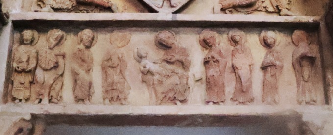 | Au centre du linteau, se trouve une rare représentation de la Vierge Marie allaitant l'Enfant Jésus à l'époque romane. Marie est entourée à sa droite de quatre saints hommes (Moïse, Pierre tenant la clé, Paul et Etienne portant le livre et vêtu de la dalmatique et de l'étole, costume de diacre), et à sa gauche de quatre saintes femmes non identifiées. |