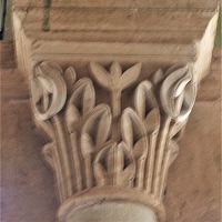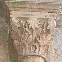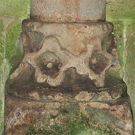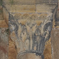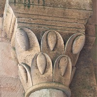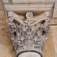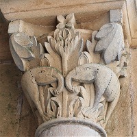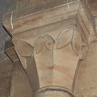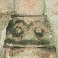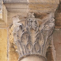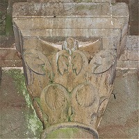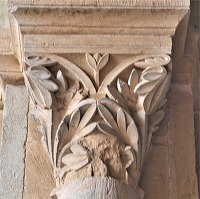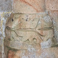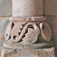 | Les bases de colonnes du narthex sont également sculptées de têtes monstrueuses ou animales, de feuillages, d'oves, de fleurs etc.. |