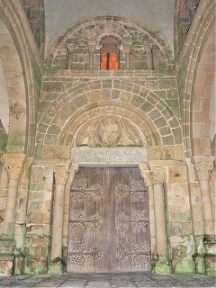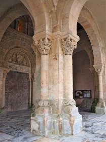 | Les colonnettes recevant la voussure encadrant le tympan, sont couronnées de chapiteaux historiés : à gauche, les ermites saint Paul et saint Antoine au désert, et à droite, le combat entre un oiseau tricéphale et un guerrier (faune?). Les corbeaux supportant le linteau, présentent deux anges combattant : à gauche, l'archange Michel écrasant un dragon sous ses pieds, et à droite, un ange brandissant une épée, défendant un personnage derrière le bouclier. |