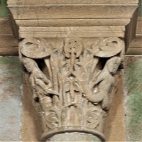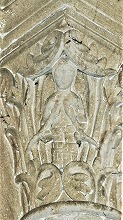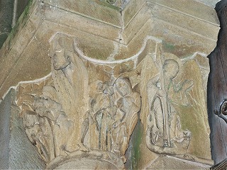 | タンパンを囲むヴシュールから繋がる小円柱には聖人伝の柱頭があり、左側の柱頭には荒野で隠遁生活を送るパウロと大アントニオス、右側の柱頭には、三頭の鳥と対峙する兵士(ファウヌス?)が描かれます。 リンテルを支えるコーベルには2人の闘う天使の姿があり、左側には足でドラゴンを踏み潰す大天使ミカエル、右側には、盾の後ろに隠れた人物を守りながら剣を振りかざす天使が描かれています。 |