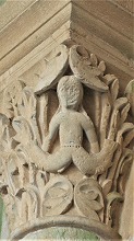 Chapiteaux sculptés du narthex ナルテックス下方の柱頭は1120-1125年頃に制作されました。このうちゾウや色欲と人魚を表現した柱頭は有名です。 その他の柱頭には、植物、果実、アカンサスの葉、松かさ等が彫刻されています。 Les chapiteaux dans les parties basses du narthex sont réalisés vers 1120-1125, dont ceux des éléphants, et de la Luxure et sirène sont notamment connus. Les autres chapiteaux sont sculptés de feuillages, de fruits, de feuilles d'acanthes et de pommes de pin. |