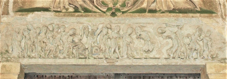 | Deux frises de part et d'autre du linteau figurent également des scènes de la Passion du Christ : la frise gauche représentant la dernière rencontre de Jésus et ses disciples endormis au Mont des Oliviers ou l'agonie du Gethsémani, et celle droite du Reniement de saint Pierre. |