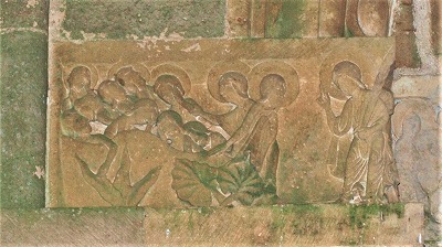 | リンテル両脇のフリーズにもキリストの受難の場面が描かれ、左側のフリーズには、ゲツセマネの園での祈りの場面、右側のフリーズには、ペトロの否認が見られます。 | ||