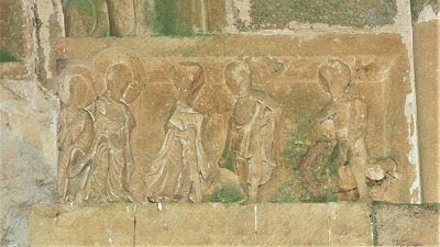| リンテルのスタイルはタンパンのそれとは異なります。 タンパンより少し後に白石灰岩で制作されたリンテルにはキリストの受難が表現されており、左からユダの接吻、ゲツセマネでのイエスの捕縛、ピラト総督とイエスが描かれています。 |
