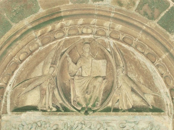 | Le tympan en plein cintre présente le Christ en majesté, levant la main droite et portant un livre de sa main gauche. Sa mandorle est portée par deux séraphins à trois paires d'ailes ocellées. |