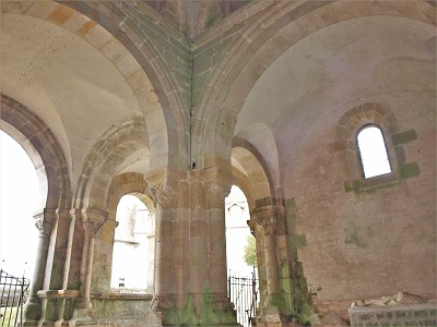 Absidioles 今日内陣の両脇には後陣祭室がありますが、元来はその両脇に隣接した後陣祭室が2つずつありました。 各後陣祭室のアプス手前の最初の方形のベイ(或いは内陣の両側廊)は、未だ11世紀のままのようです。 現在の南後陣祭室は内陣よりも後に造られました。 Aujourd'hui, le choeur est encadré de deux absidioles : le choeur primitif était flanqué de quatre absidioles échelonnées. Les premières baies droites des absidioles (ou les collatéraux du choeur) seraient du 11e siècle. L'actuelle absidiole sud est plus tardive que le choeur. |