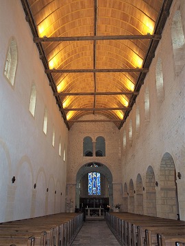 Nef オットー・スタイルの身廊は、1020-1030年頃に造られました。次に12世紀初めに、新設のナルテックスと連結するために、西側に1ベイが追加されて拡張されました。 元来身廊には木造天井が張られていましたが、19世紀より木組みの天井に造りかえられています。 La nef de style ottonien date des années 1020-1030. Elle s'est élargie du coté ouest, par une travée au début du 12e siècle, pour communiquer avec le nouveau narthex. A l'origine plafonnée, la nef est actuellement couverte de la voûte en bois du 19e siècle. |